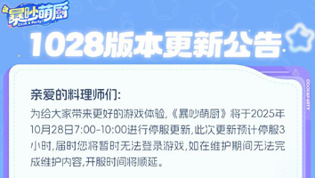 《暴吵萌厨》于【2025年10月28日7:00-10:00】进行停服更新